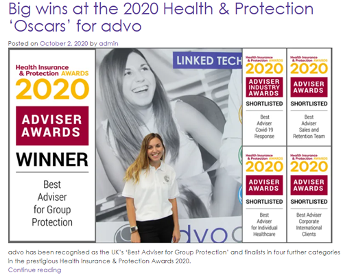 advo are finalists in two of the nine categories, the ‘Best Healthcare Intermediary’ and the UK’s Employee Benefits Intermediary for the Year for 2020.
