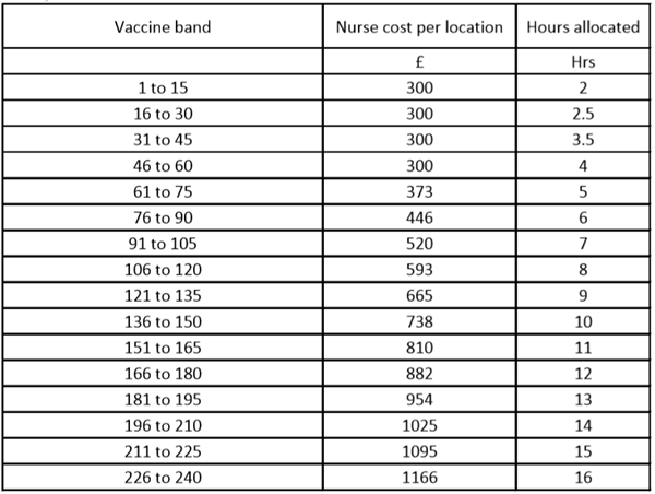 There is a separate charge for the nurse which varies depending on the number of vaccines with a minimum charge of £300 for their time. This includes all clinical and travel costs. An indication of nurse costs are outlined below.