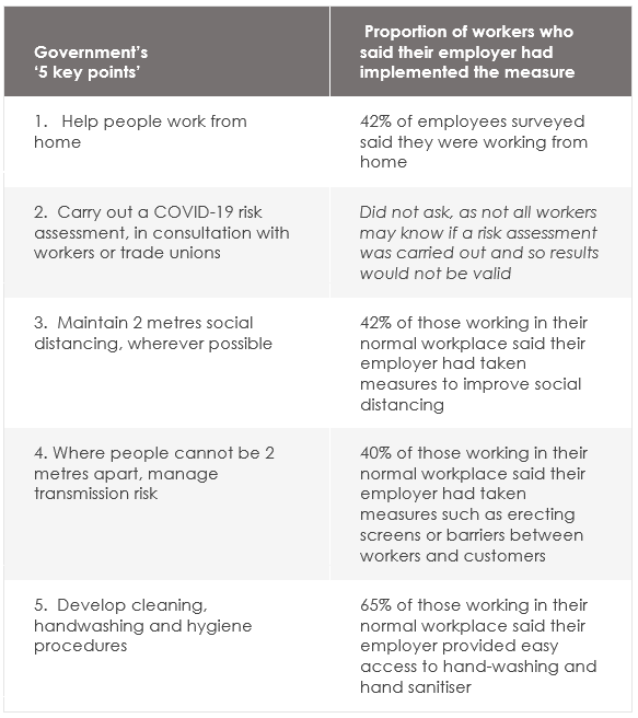 While welcome, this shows that many businesses still have a long way to go to fully comply with the government’s five point plan for safely returning to work and being Covid-Secure. Below we’ve compared the government’s plan against how many employees said their employer had taken these measures: