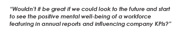 Personally, I’d like to see a shift in focus to measuring the positive impacts of a well-executed well-being strategy across a workforce. One where we hold ourselves to account on more holistic measures like sense of purpose, energy, connectedness, happiness and gratitude. As well as absenteeism and the like, businesses could then validate the impact of the initiative back to harder measures such as employee engagement results and even, dare I say, health insurance claims and outcomes. Wouldn’t it be great if we could look to the future and start to see the positive mental well-being of a workforce featuring in annual reports and influencing company KPIs?