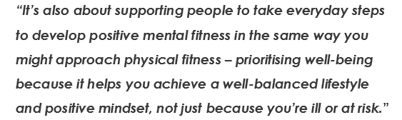 Our focus is about empowering members and supporting them wherever they are with their mental health journey. It’s also about supporting people to take everyday steps to develop positive mental fitness in the same way you might approach physical fitness – prioritising well-being because it helps you achieve a well-balanced lifestyle and positive mindset, not just because you’re ill or at risk.