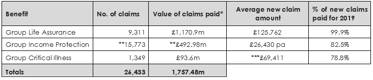 * All values are rounded **Total number of claims paid (new and existing) during 2019 and value of claims in payment as at 31 December 2019, including any claims paid for part of 2019. Group income protection claims are often paid for several or many years so the ultimate value of these benefits will be much higher. ***During 2019 there were 5,312 new group income protection claims, totalling £140.4m pa and averaging £26,430 pa.