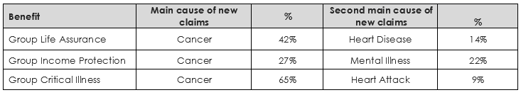 Cancer was the main cause of claim across all three group risk products during 2019, followed by either heart disease or mental health.