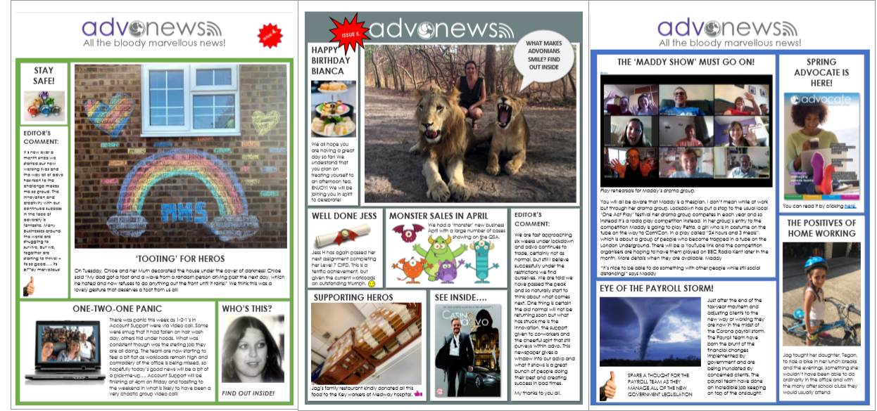 We realise that connectivity is key. We firstly changed our approach from hours based to tasked based working to allow greater flexibility to those with added home responsibilities. Then set about ensuring individual teams and the group as a whole retained connectivity. We use technology as much as possible to keep in touch with video conferencing. Often team chats and updates will have a theme to make it more interesting. For example, a  recent account manager team meeting had a Casino theme with dressing up and clever backdrops. We also have a weekly newspaper called ADVOGOODNEWS News where we report on all the gossip and news within the group with pictures and achievements and successes, both work and non-work reported, basically anything else that will bring a smile. Additional contact such as weekly quizzes also helps. I understand plans are afoot to replace this month’s team building event to bring online.