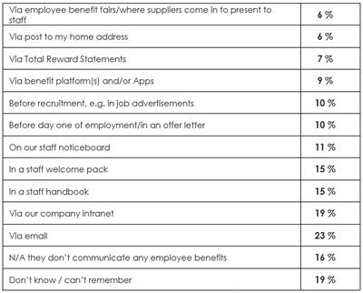 By far the most popular method for communicating benefits is in a staff welcome pack (38%). Posting details to home addresses was the least popular, according to employers.
